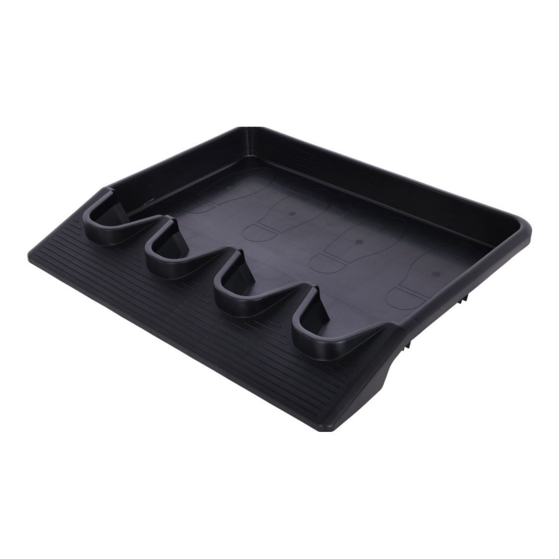 Innovative Schuh- und Stiefelausziehwanne. Entwickelt für müheloses freihändiges Ausziehen und sauberes Aufbewahren von Schuhen und Stiefeln.