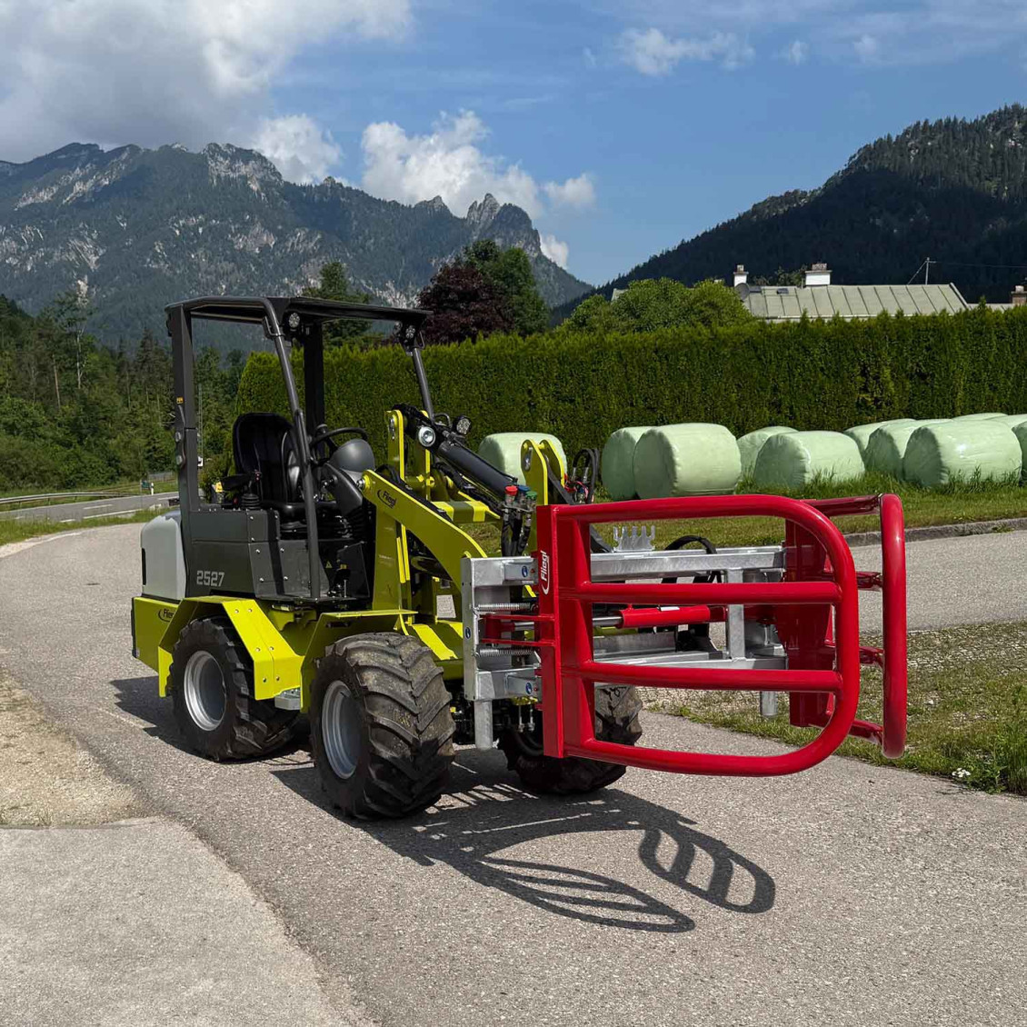Die kompakte und schonende Bauform ermöglicht ein Beladen und Stapeln der Rundballen ohne den Ballen zu beschädigen.