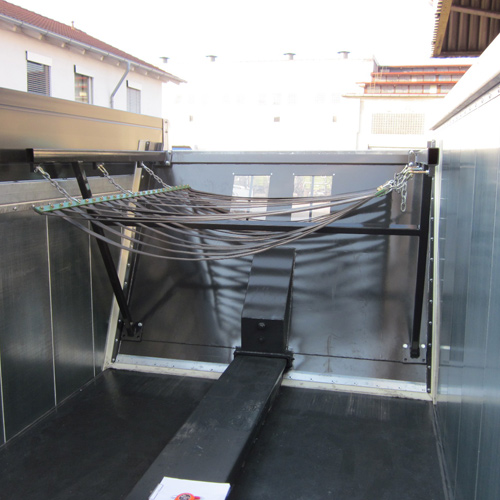 Fallsegel werden im Fahrzeug, in dem die Ernte eingeladen wird montiert. Das Gut fällt zuerst auf die breiten Bänder, dass denn Fall abdämpft und landen anschließend erst im Fahrzeug. Das Erntegut wird vor Beschädigungen geschützt.
