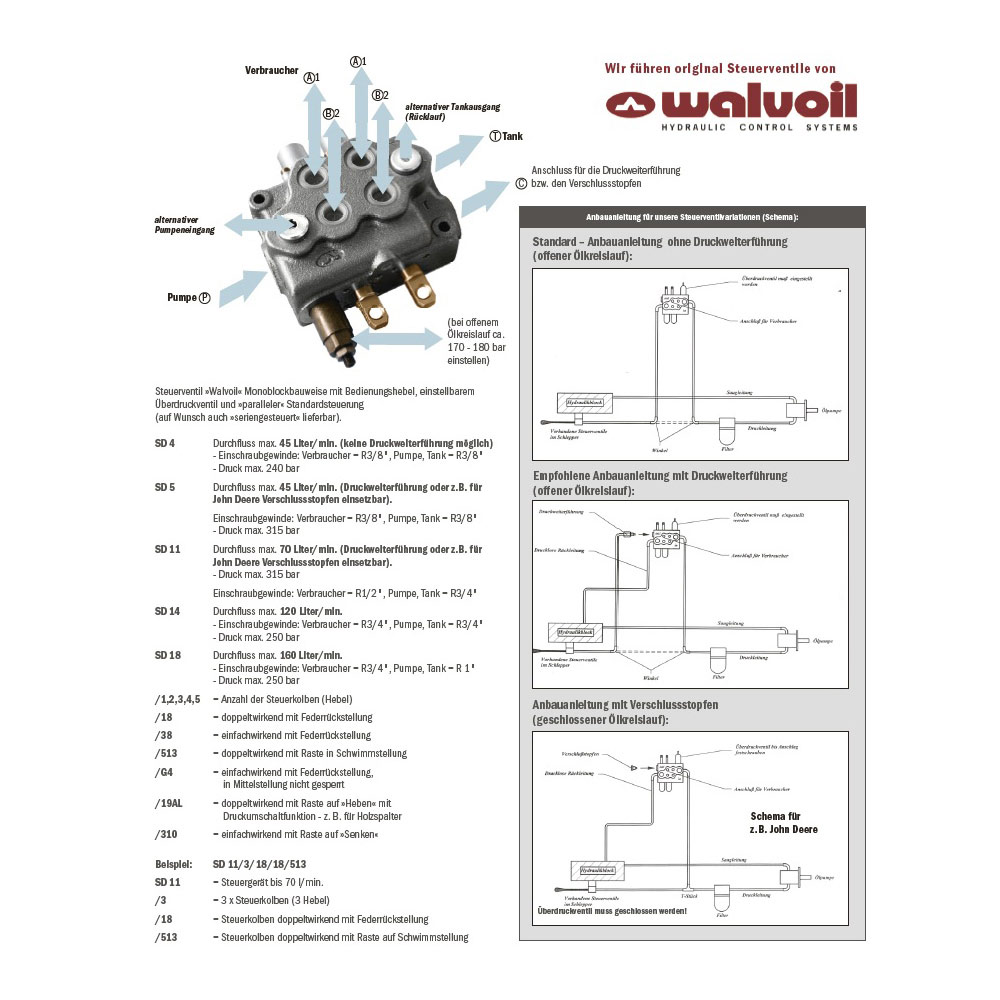 • SD 5       - Durchfluss max. 45 Liter/min. (Druckweiterführung oder z.B. für John Deere Verschlussstopfen einsetzbar).