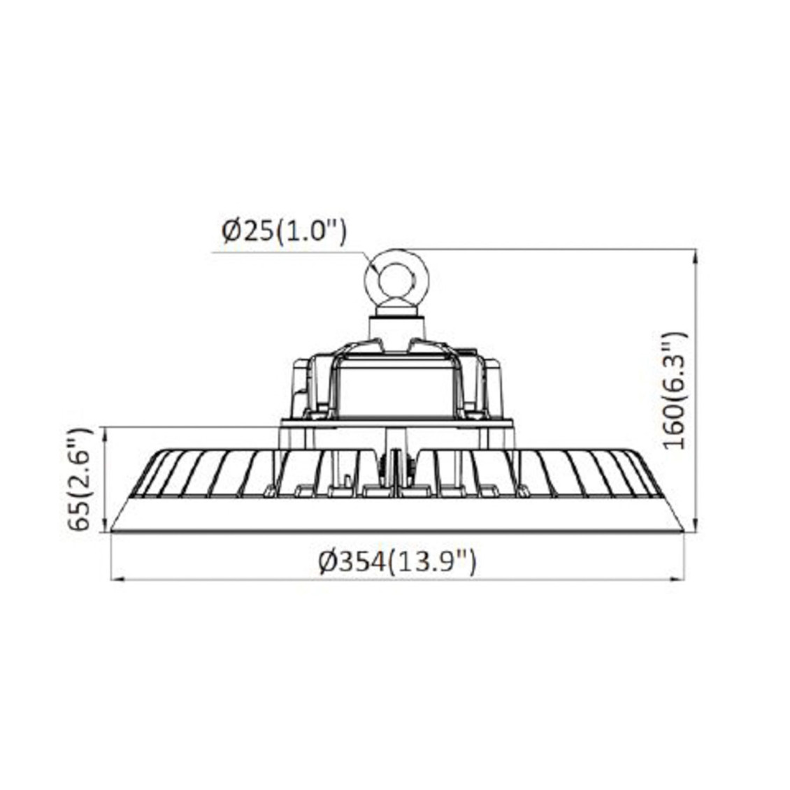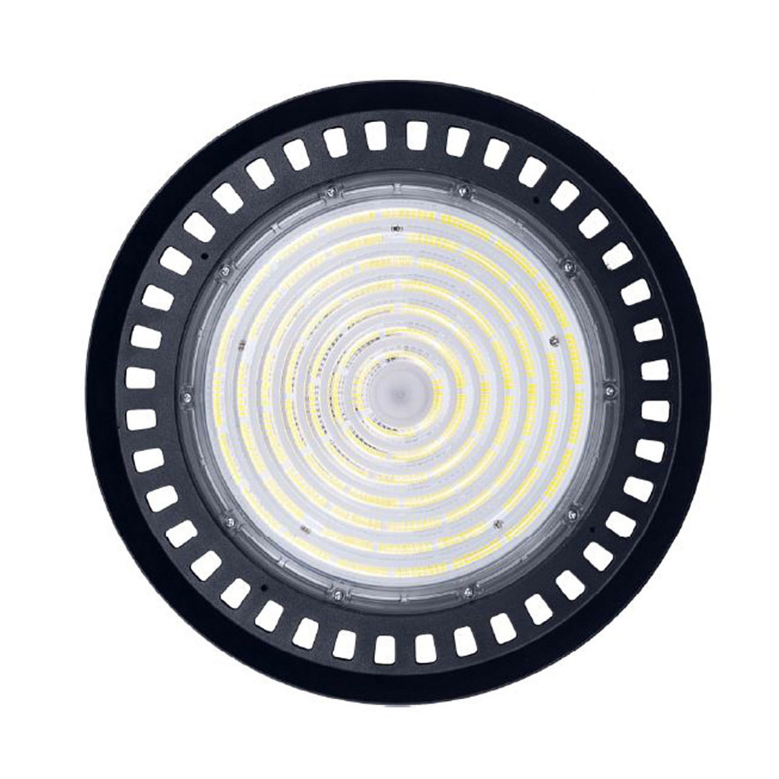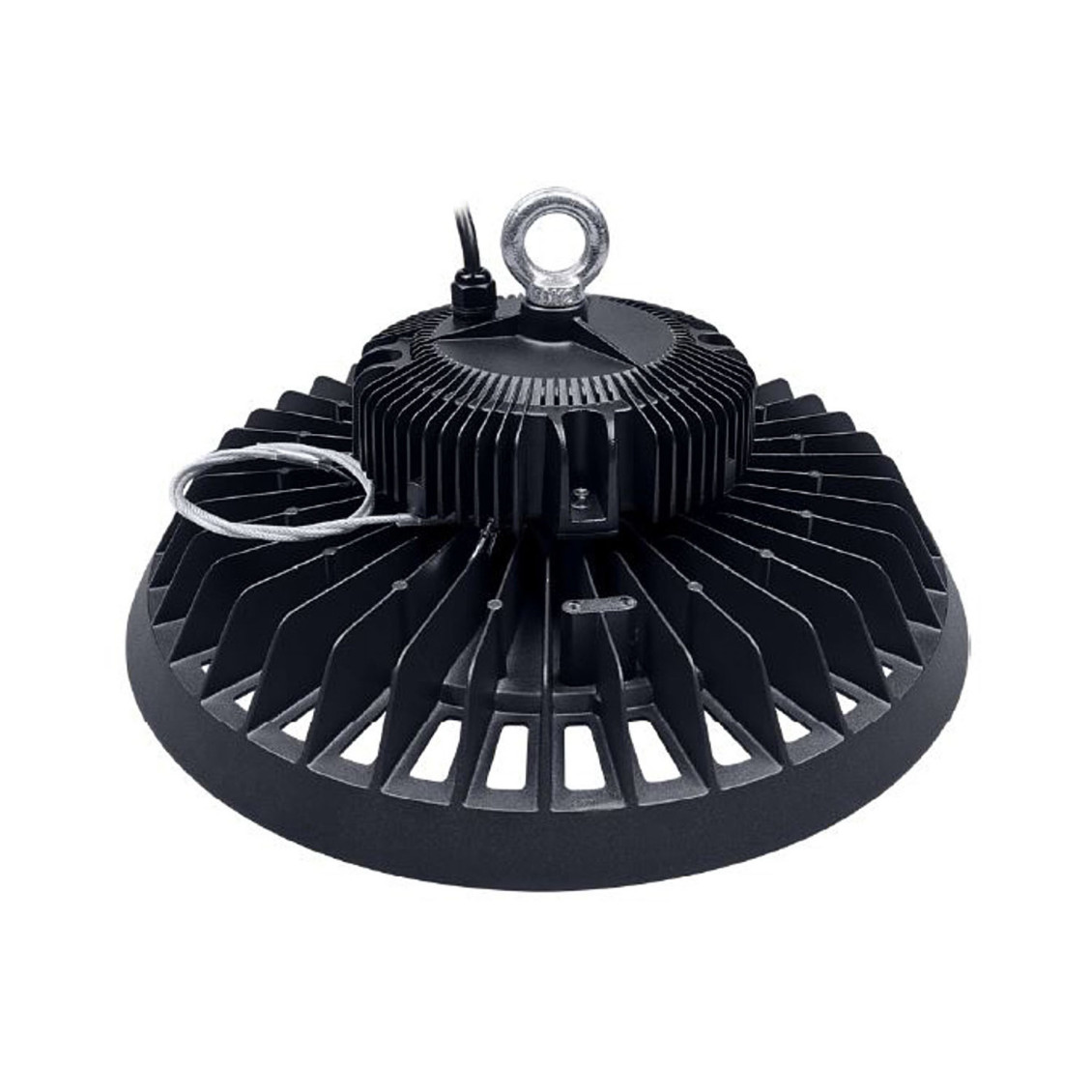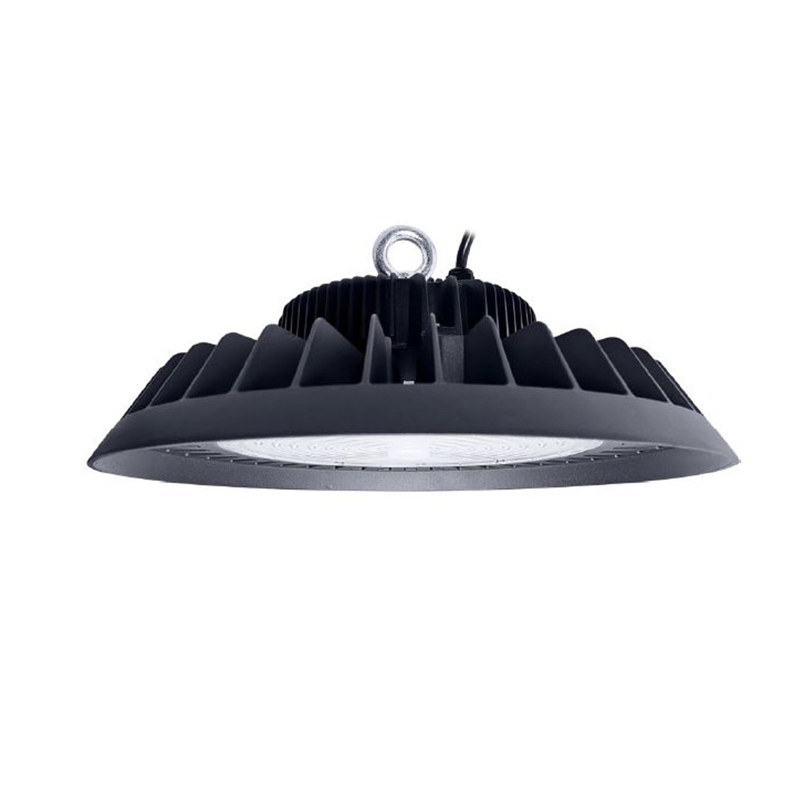» Lichtausbeute: 160 lm/w » Lichtstrom: 32000 Lumen » Farbtemperatur: 5700 K » Abstrahlwinkel: 110° » 476 LED's » Farbwiedergabe (CRI): Ra≥70 (Ra≥80 optional) » Eingangsspannung: 100-277V » Gehäuse: schwarz, aus Aluminiumguss » Arbeitstemperatur: -30°C bis +50°C » Betriebsfeuchtigkeit: 10% - 90% » Durchschnittliche Lebensdauer: (L70/B10): > 50.000h » Leistungsfaktor: PF > 0,90 » Energieeffizienzklasse: C » Schutzart: IP 65 » Standardabweichung der Farbanpassung: <5 » Startzeit: <0,2 s » Aufwärmzeit bis 60 %: <0,5 Sek » Lumenwartung bei e.o.l.: >70% » Nicht dimmbar » Maße: Ø 354 mm / Gesamthöhe (mit Öse Ø 25 mm) 160 mm » Nettogewicht: 3,2 kg » Bruttogewicht: 4,0 kg » Garantie: 5 Jahre » Inkl.: Aufhänge-öse und rostfreier Stahl