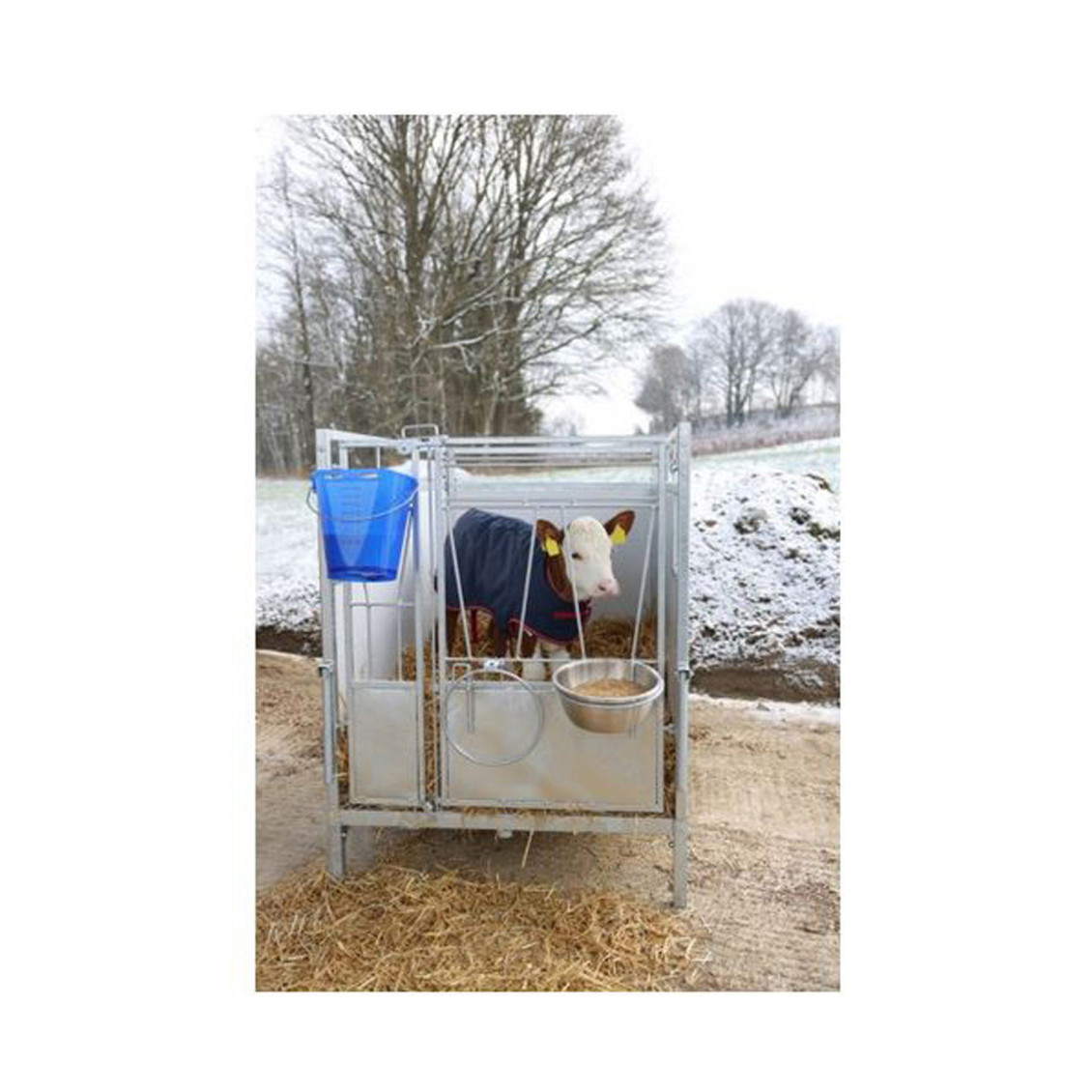Dank des schwenkbaren Bodens lässt sich die Kälberbox Premium schnell entmisten und komfortabel reinigen. Durch absenken des Frontladers verriegelt der Klappboden automatisch. Die zweigeteilte Türe ist ideal zum Anlernen der Kälber an die Nuckeleimer. Der Landwirt kann die Box verlassen, ohne das Kalb beim Tränken zu stören. Die Kälberbox sorgt dafür, dass das Kalb viel frische Luft erhält, aber keiner Zugluft ausgesetzt wird. Ebenso wird es von schädlichen Krankheitskeimen abgeschirmt. Das Tier liegt in der Kälberbox nicht direkt auf dem Boden, sondern auf den erhöhten Rosten. Somit hat es das Kalb wärmer und trockener.