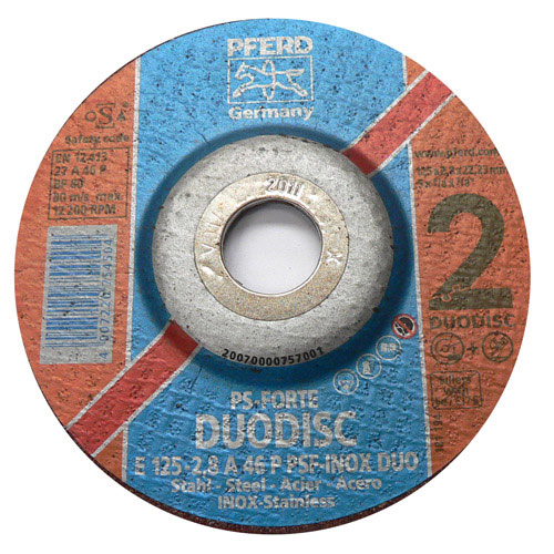 Vorteile: Höchster Qualitäts- und Sicherheitsstandard durch die robuste, form- und seitenstabile Scheibenausführung. Reduziert die Arbeitskosten durch die Einsparung von Rüstzeiten (weniger Scheibenwechsel). Leistungsstark durch aggressives Schleifmittel und hochwertige Schleifkornbindung. Kombischleifscheibe DUODISC entspricht den Vorgaben der EN12413:2007. Schleifmittel: Korund A Ohne Zugabe von eisen-, chlor- und schwefelhaltigen Füllstoffen gefertigt.