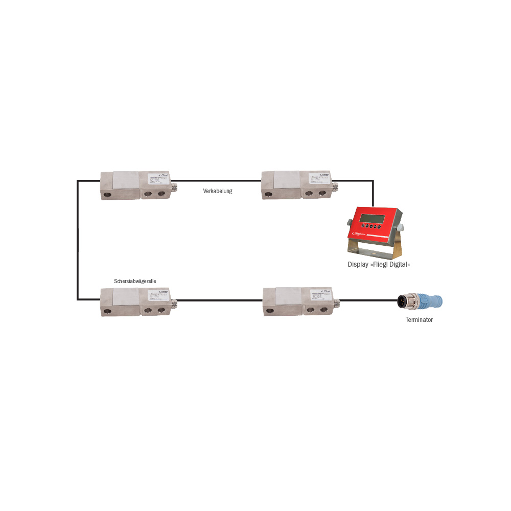 Fliegl verwendet hierfür Digitale Wägezellen, der große Vorteil von diesem System ist, dass keine Kalibrierung notwendig ist. Ist das Wiegesystem eingebaut, wird es mit einem Knopfdruck austarriert und man kann mit der Arbeit beginnen. Zu einem funktionierenden Satz gehören mindestens 1 Wägezelle, Verbindungskabel, 1 Display und als Abschlusswiderstand ein Terminator.